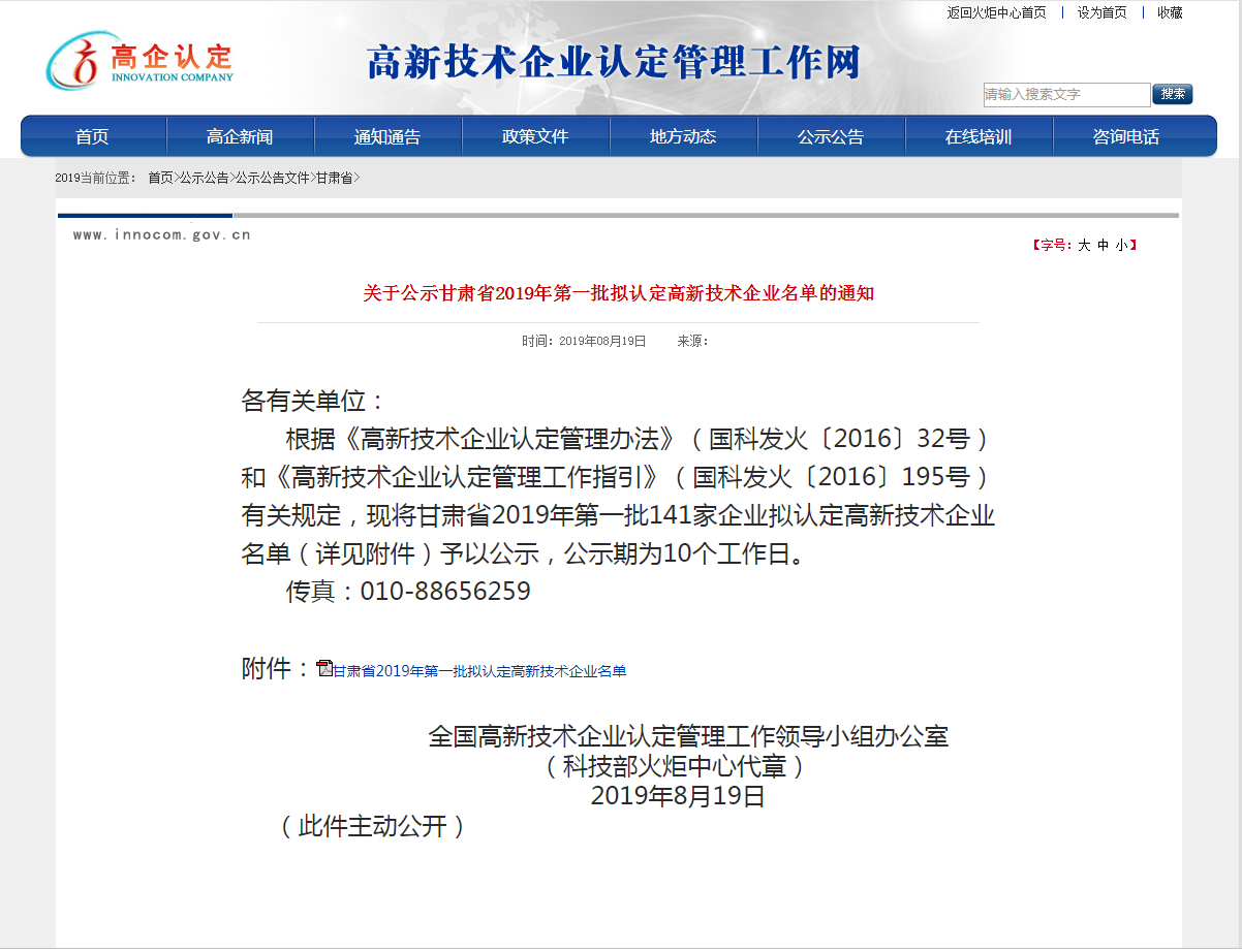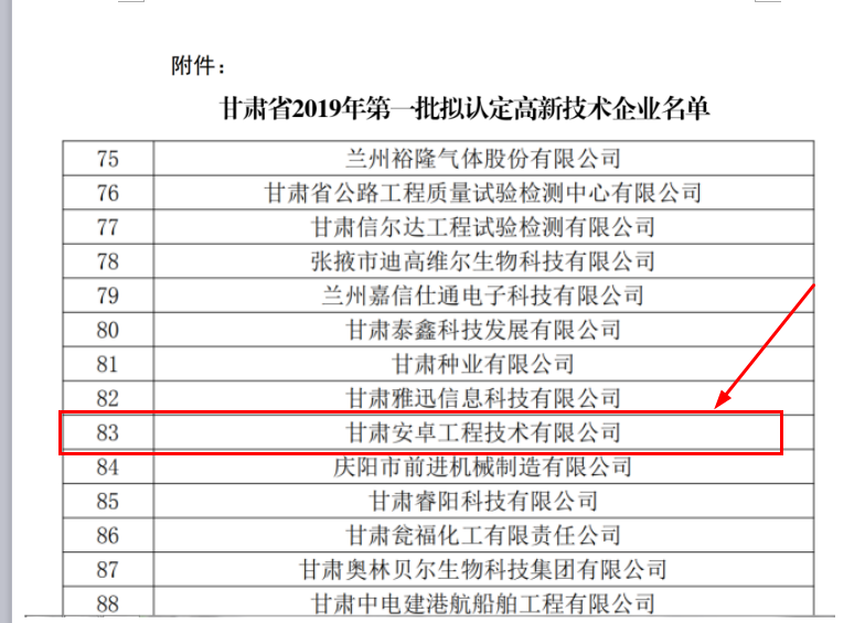 根據(jù)《高新技術(shù)企業(yè)認定管理辦法》(國科發(fā)火〔2016〕32號)和《高新技術(shù)企業(yè)認定管理工作指引》(國科發(fā)火〔2016〕195號)有關(guān)規(guī)定,經(jīng)公司申報、地方初審、專家審查等嚴(yán)格的申報程序,于2019年8月19日在“國家高新技術(shù)企業(yè)認定工作網(wǎng)”上公示了“甘肅省2019年第一批擬認定高新技術(shù)企業(yè)名單”甘肅安卓工程技術(shù)有限公司榜上有名。