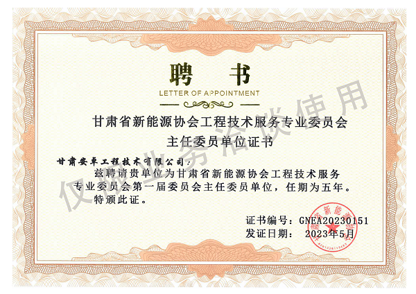 甘肅省新能源協會工程技術服務專業委員會主任委員單位證書