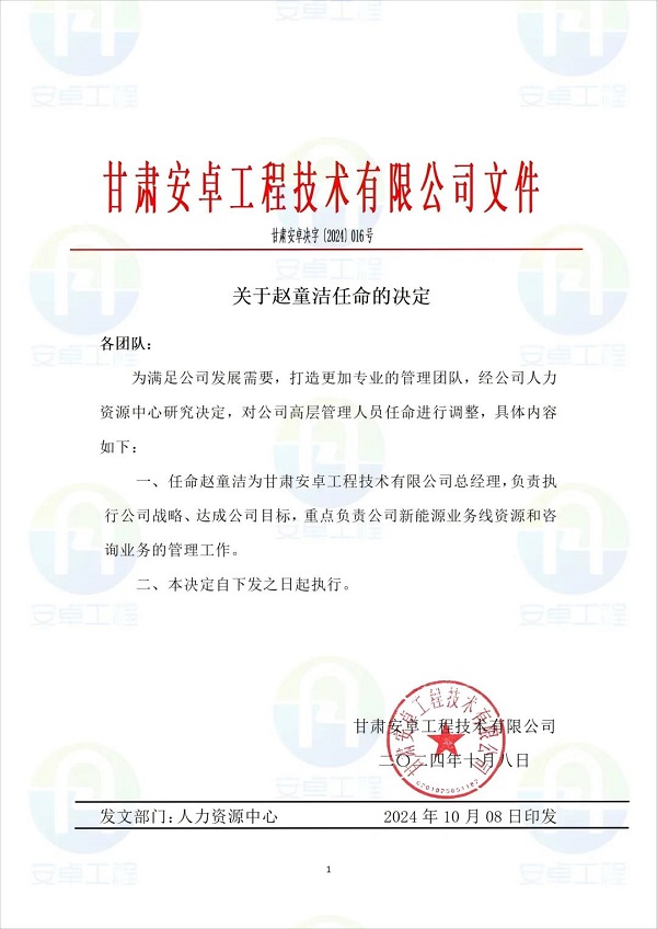 近日,甘肅安卓工程技術有限公司發布重大人事任命,任命趙童潔為甘肅安卓工程技術有限公司總經理,負責執行公司戰略、達成公司目標,重點負責公司新能源業務線資源和咨詢業務的管理工作。
