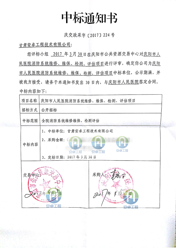 【中標公示】天水卷煙廠消防系統年度檢測中標通知書