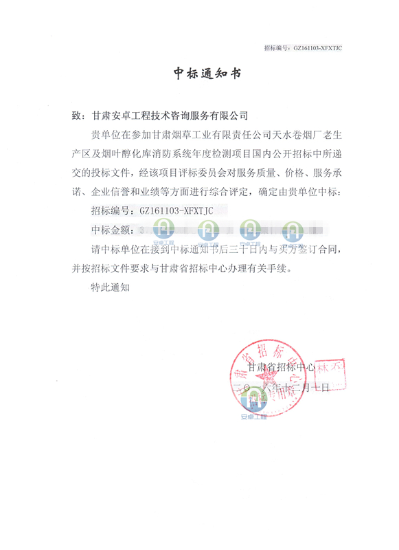 【中標公示】天水卷煙廠老生產區及煙葉醇化庫消防系統年度檢測中標通知書