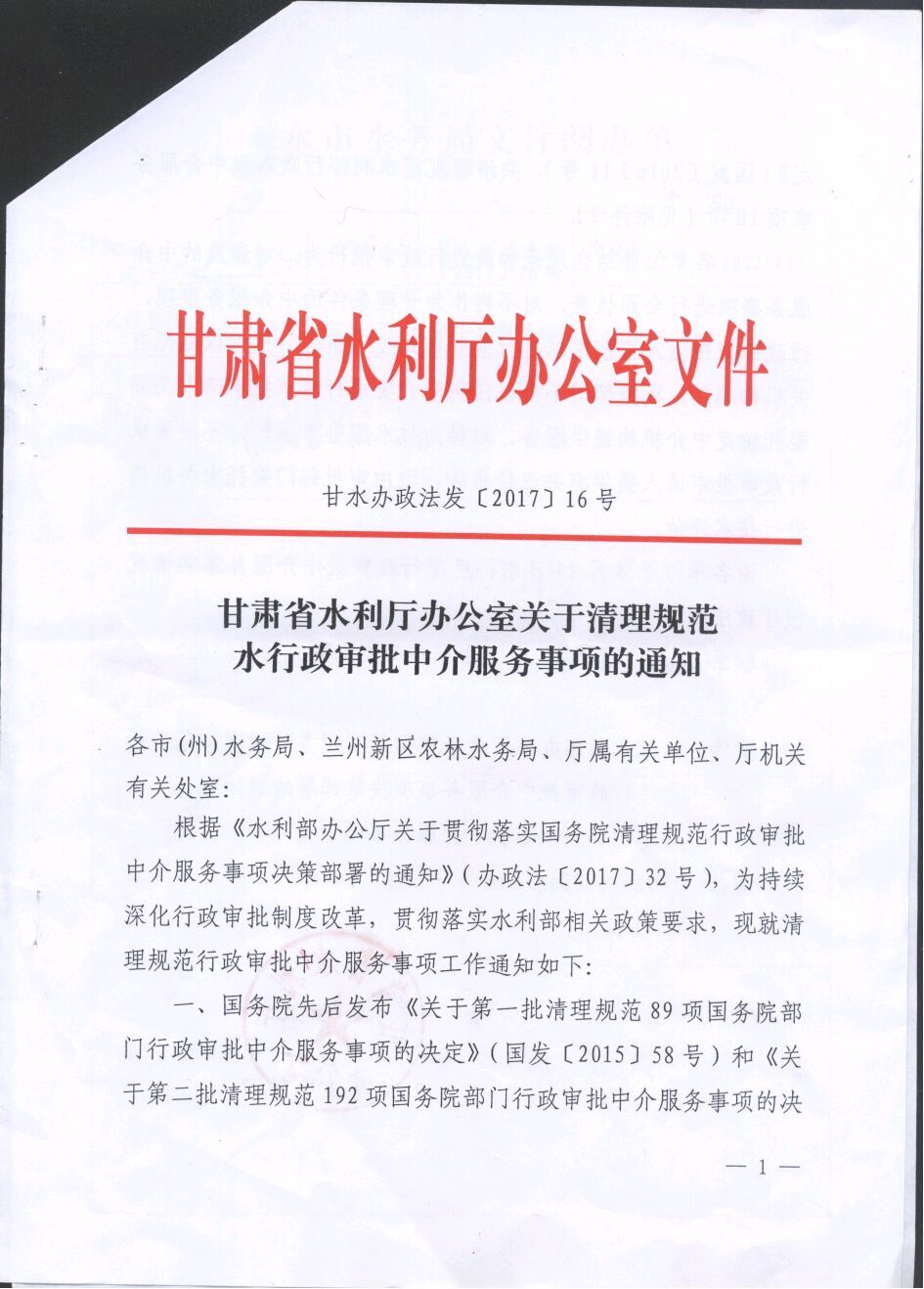 甘肅省水利廳辦公室關于清理規范 水行政審批中介服務事項的通知