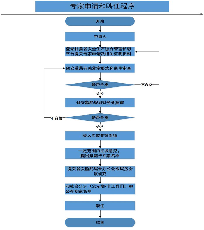 (二)省安監局有關處室(單位)登錄專家管理系統對相關專業組專家申請材料進行形式和條件審查,審查通過后由省安監局規劃財務處對專家申請材料進行復審并錄入專家管理系統;