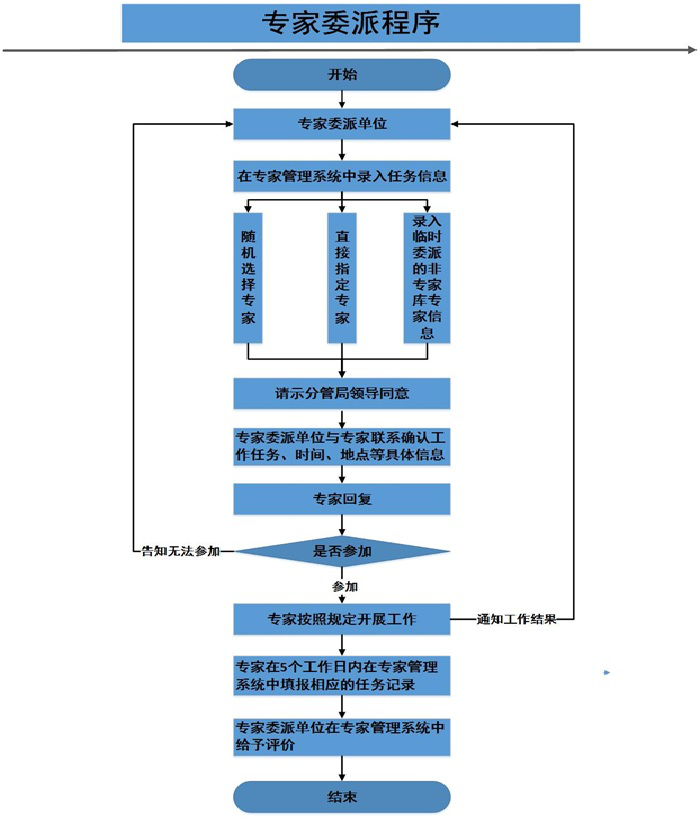 (一)委派專家任務的單位(省安監局機關有關處室、單位,以下簡稱專家委派單位)應根據任務需要,在專家管理系統中錄入任務相關信息,從專家庫中隨機選擇專家,特殊情況可直接指定專家;專家庫專家不能滿足任務需要時,專家委派單位在請示分管局領導同意后,可委派專家庫之外的專家執行委派任務,并在專家管理系統中錄入臨時委派任務的專家信息;