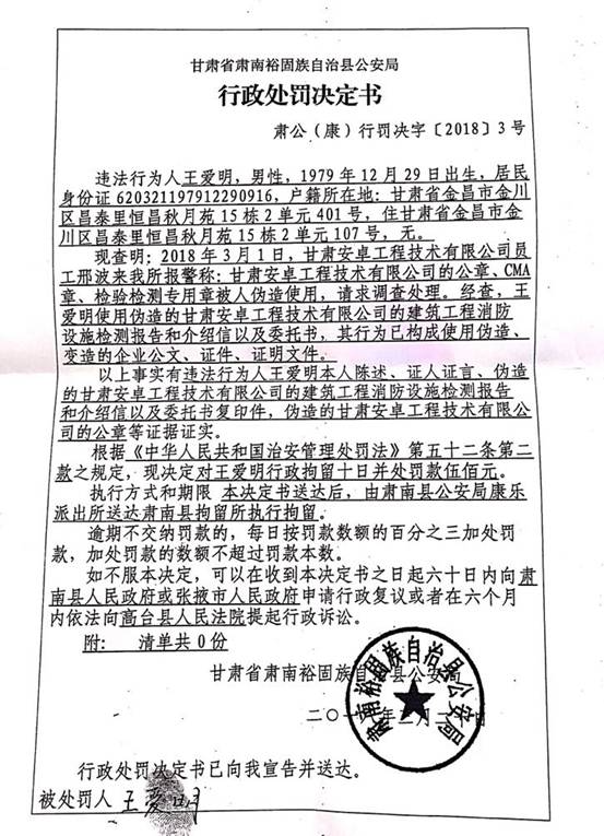 《甘肅省肅南裕固族自治縣公安局行政處罰決定書》肅公(康)刑罰決字【2018】3號文件,查明王愛明偽造甘肅安卓工程技術(shù)有限公司的建筑工程消防設(shè)施檢測報告、介紹信、委托書、公章等違法事實。