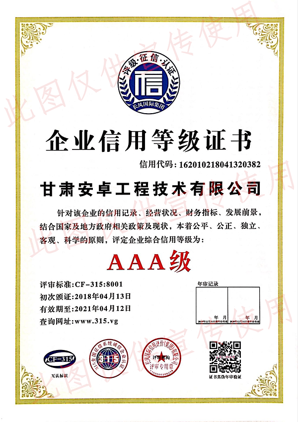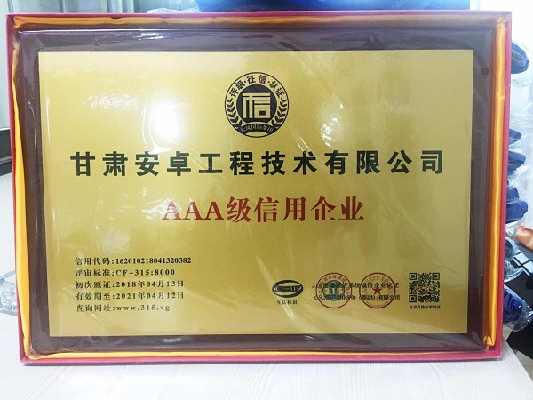 近日,我公司榮獲AAA級企業(yè)信用等級證書,標(biāo)志甘肅安卓在履約能力、客戶信用、質(zhì)量管理等綜合實力與競爭力再次獲得權(quán)威肯定。